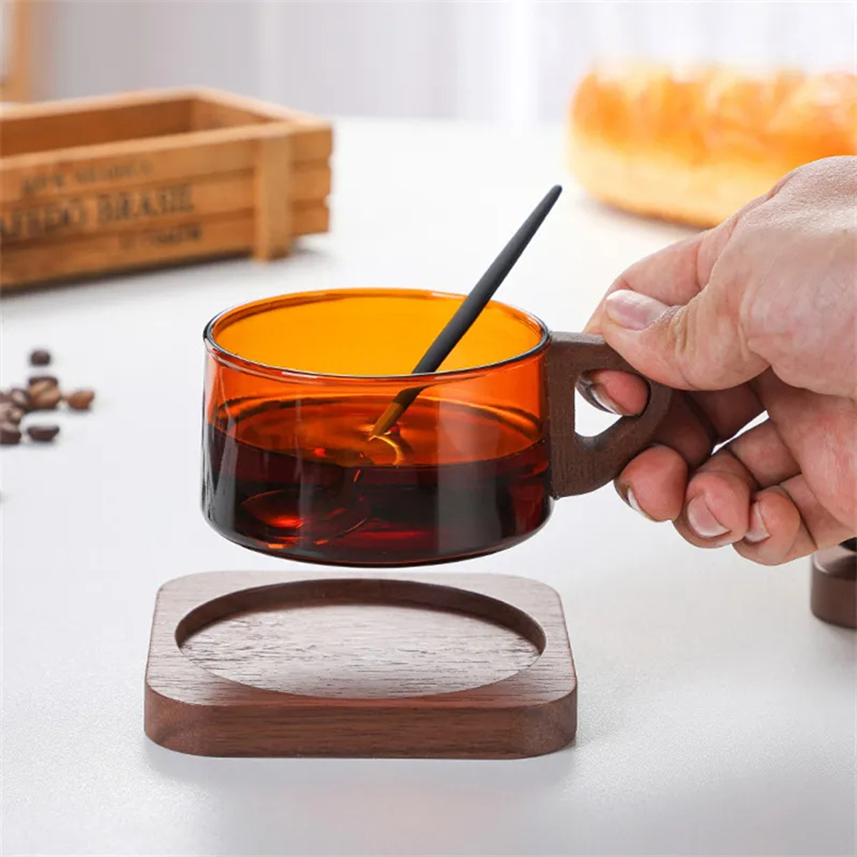 Enjoy your favorite coffee in style with the 200ml Glass American Latte Coffee Cup with Wooden Tray. Made from high-borosilicate heat-resistant glass, this luxurious and durable coffee cup withstands temperatures from -20°C to +150°C, making it perfect for hot and cold drinks. Its compact design ensures a comfortable grip, while the elegant wooden tray adds a sophisticated touch. Available in multiple colors, this stylish coffee mug is an ideal gift for coffee lovers.