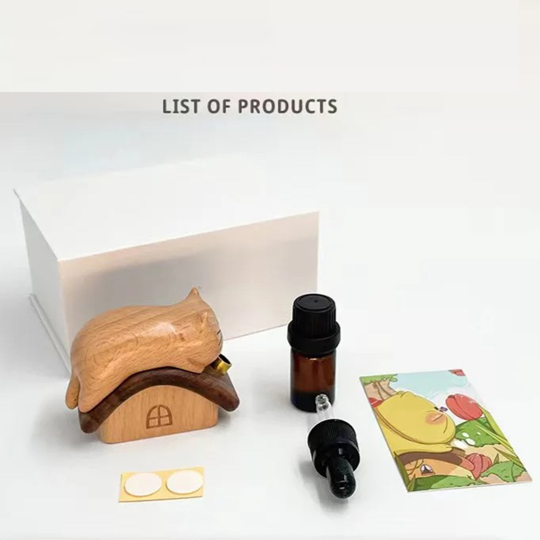 Bring the warmth of natural wood and the benefits of aromatherapy into your home with this Japanese Solid Wood Aromatherapy Diffuser. Designed with an adorable Cat on the Roof motif, this charming and functional diffuser absorbs and disperses essential oils naturally, creating a soothing atmosphere. Whether placed in your bedroom, office, living room, or car, it adds a delightful touch while keeping your space fresh and tranquil.